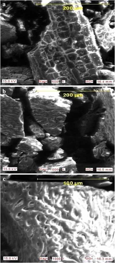 掃描電子顯微鏡通過用聚焦的電子束掃描來產(chǎn)生樣品的圖像。甲酸和乙酸吸附前后制備的活性炭的SEM圖如圖2所示 。 圖2a顯示吸附前活性炭的形態(tài)。碳表明活性炭的表面性質(zhì)是高度多孔的,并且會增強甲酸和乙酸的吸附。碳呈現(xiàn)不規(guī)則的網(wǎng)狀結(jié)構(gòu),這意味著由粗糙表面積組成的完整的三維多孔內(nèi)部結(jié)構(gòu)的形成。熱解過程中焦炭的孔隙發(fā)育也很重要,因為這將通過促進活化劑(HNO 3)分子擴散到孔中從而增加活性炭的表面積和孔體積,從而增加HNO 3碳相互作用,在活性炭表面產(chǎn)生更多的孔?;钚蕴勘砻嫔线@些孔的發(fā)育可能是導(dǎo)致水溶液中乙酸和加速那吸收量高的主要因素。很明顯在圖2 B,C的吸附前活性炭的表面上的大的孔碳的表面上吸附的吸附后均減少。這意味著甲酸和乙酸被吸附到制備的活性炭的表面上。