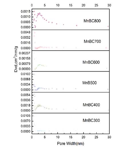 活性炭表面積和孔體積:活性炭的大部分孔徑分布在20和200之間,這表明碳主要是中孔(圖2)。表1顯示了碳化溫度和錳的顯著影響氯化物對孔隙發(fā)育和比表面積的影響。比表面積和孔體積隨著溫度從300℃升高到500℃而增加,在600℃時(shí)顯著下降,然后從600℃升高到800℃時(shí)再次增大。平均孔徑與表面積和孔體積呈相反的變化規(guī)律。出乎意料的是,高碳化溫度下的平均孔徑呈現(xiàn)出與以前研究不同的變化趨勢:孔徑不增加,反而下降。通常,活性炭的孔徑分布取決于活化溫度,原料和保留時(shí)間。在一定溫度范圍內(nèi)增加碳化溫度增加了前體中揮發(fā)性物質(zhì)的演變,使得孔隙發(fā)育的益處和創(chuàng)造新的孔隙。的熱解作用,當(dāng)超出該范圍時(shí),會(huì)造成微孔的崩潰和微孔的寬顯著量中孔,質(zhì)量只是下降。高熱解溫度下的異常變化趨勢表明,活化劑必須在生物炭的孔結(jié)構(gòu)和比表面積上有所不同。