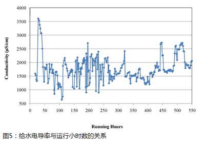 在此任務(wù)期間,活性炭綜合處理系統(tǒng)每天進行操作和測試,每天監(jiān)測和記錄pH,溫度,飼料壓力,流速,飼料電導(dǎo)率和濁度等操作參數(shù)。如圖2所示,系統(tǒng)給水溫度在冬季和夏季分別在24.90和41.30℃之間。如圖3所示,此期間給水的pH在6.06和12.17之間。進料濁度值和濾液濁度值分別在6.59-429NTU和0.09-17.4NTU,如圖4所示。濁度測量單元是過濾器制造商推薦的濁度濁度單位(NTU)。進水的電導(dǎo)率也進行了監(jiān)測,發(fā)現(xiàn)在監(jiān)測期間(圖5)所示的電導(dǎo)率在79.9和3610μS/ cm之間。在實驗測試程序開始時,試驗系統(tǒng)在可變操作條件下進行測試,以確定系統(tǒng)的最佳操作條件。進水的電導(dǎo)率也進行了監(jiān)測,發(fā)現(xiàn)在監(jiān)測期間(圖5)所示的電導(dǎo)率在79.9和3610μS/ cm之間。在實驗測試程序開始時,試驗系統(tǒng)在可變操作條件下進行測試,以確定系統(tǒng)的最佳操作條件。進水的電導(dǎo)率也進行了監(jiān)測,發(fā)現(xiàn)在監(jiān)測期間(圖5)所示的電導(dǎo)率在79.9和3610μS/ cm之間。在實驗測試程序開始時,試驗系統(tǒng)在可變操作條件下進行測試,以確定系統(tǒng)的最佳操作條件。