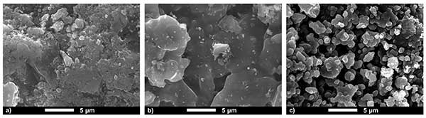 圖1. 活性炭C40/4的掃描電子顯微鏡圖像(a)未涂覆的,(b)涂覆有二氧化硅(SiO2)和(c)涂覆有碳化硅(SiC)的活性炭。