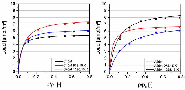 圖2顯示極性溶劑丙酮在25攝氏度的吸附等溫線。未涂覆的活性炭A35/4與活性炭C40/4相比的負(fù)載顯著較高。兩種碳都是由相同的原料制造的,但活性炭A35/4在水蒸氣氣氛中經(jīng)過較長(zhǎng)時(shí)間的活化。由于原始生產(chǎn)過程中氧化條件下活化時(shí)間較長(zhǎng),活性炭A35/4具有較高的極性表面基團(tuán)數(shù)量,有利于極性丙酮的吸附。在700攝氏度下涂覆的樣品的負(fù)載對(duì)于兩種類型的活性炭具有相同的數(shù)量級(jí),因?yàn)橛捎趦?nèi)部孔系統(tǒng)的涂覆,表面特性的差異減小,并且表面化學(xué)的相關(guān)修改。2涂層和極性丙酮,極性活性炭A35/4上的負(fù)載僅略有變化。在820攝氏度下涂覆的樣品也具有可比較的負(fù)載。由于非極性SiC涂層和由此導(dǎo)致的較弱的相互作用,負(fù)載低于在700攝氏度下涂覆的樣品的負(fù)載。