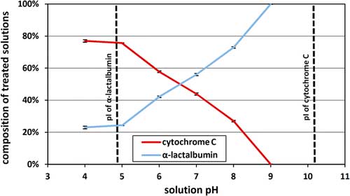 現(xiàn)用活性炭處理1:1溶液后剩余的細(xì)胞色素c和α-乳白蛋白的百分比隨溶液pH而變化很大。在pH4.0和5.0時(shí),在等電點(diǎn)4.8附近除去最大量的α-乳白蛋白。(28)相比之下,最大量的細(xì)胞色素c在pH9.0被除去,最接近蛋白質(zhì)的等電點(diǎn)10.5。(27)在6.0或7.0的中等pH下,活性炭除去了相似量的兩種蛋白質(zhì)。