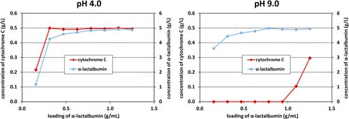圖2. 在pH4.0或pH9.0的0.5mg / mL的細(xì)胞色素c和5.0mg / mL的α-乳清蛋白溶液通過(guò)色譜柱后,收集12.5mL級(jí)分中的細(xì)胞色素c和α-乳清蛋白的濃度活性炭。
