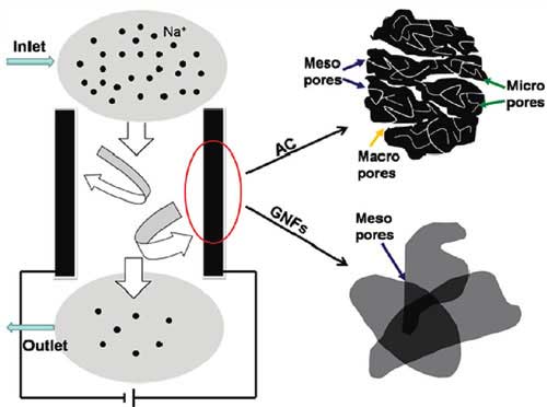 電容去離子技術采用活性炭和石墨烯納米片(GNFs)電極的機理。在研究人員進行的實驗中,他們將石墨烯納米片基電極與傳統(tǒng)活性炭電極進行了比較。他們指出,“盡管具有較大的表面積(989.54米2 /克)比石墨烯納米薄片(222.01米2 / g)中,活性炭具有僅13.73微摩爾/克,這比石墨烯納米薄片的低得多的electrosorptive容量(其電吸附容量為23.18μmol/ g)“。