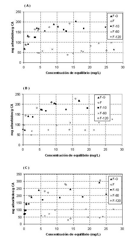活性炭呈現(xiàn)基本特性pH值PZC接近9. OHBT相對(duì)于MeBT和BT的吸附容量的增加可能與芳族體系中電子密度的增加有關(guān)。與甲基相比,羥基增加了芳族體系的電子密度。苯并噻唑分子中羥基和甲基的存在引起B(yǎng)T分子的芳族體系的電子密度增加,增加了原始活性炭的吸附能力。吸附能力的增加與苯并噻唑芳環(huán)的π電子體系和碳石墨平面的電子π能帶之間的分散力的增強(qiáng)有關(guān)。在圖2A,2B和2C分別示出了BT的吸附等溫線,和OHBT MEBT上經(jīng)歷與臭氧預(yù)處理10分鐘,(F-10),60分鐘(F-60)120分鐘活性炭(F- 120),并在氮?dú)饬?FG)下在1,000℃下脫氧。