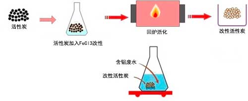 圖2?;钚蕴啃薷牡膶?shí)驗(yàn)程序?;钚蕴扛男园?:用65%的硝酸和濃硫酸氧化,2:用FeCl 3包覆氧化的活性炭。含有2.5%Fe 3+的 6H 2 O溶液(將pH調(diào)節(jié)至12,并且在80℃下進(jìn)行涂覆24小時(shí)),3:在300℃下在N2氣氛下煅燒3小時(shí),4:生產(chǎn)改性活性炭 。5:批處理。