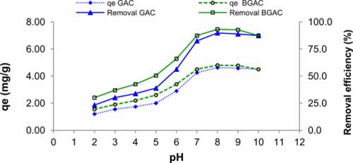 圖3。活性炭和改性活性炭在不同pH值下的脫鋁效率和吸附容量。吸附劑用量:2g / L,鋁濃度:10.3mg / L,接觸時(shí)間:24小時(shí),攪拌速度:250rpm。