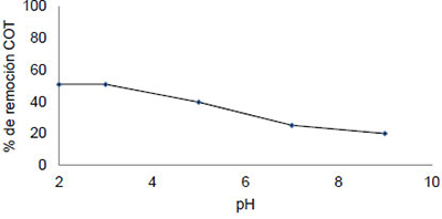對于具有官能團(tuán)相關(guān)聯(lián)的吸附現(xiàn)象增加對應(yīng)于所述頻帶3200-3600cm-1之間的信號的存在證明(拉伸振動(dòng)相關(guān)聯(lián)OH醇和羧酸),2700-3000cm-1(帶有羧酸和羰基化合物基團(tuán)相關(guān)聯(lián))和在范圍1000至1200cm-1(相關(guān)羰酸基團(tuán))。注意2250-3300cm-1之間相關(guān)聯(lián)的帶的外觀與該鏈接N + -H(離子),用于氨的吸附。在圖3中 顯示了pH對污染物中TOC吸附的影響。在酸性介質(zhì)(約50%)中獲得最大的去除率。高于pH 3.0觀察到在流出物中去除該污染負(fù)荷的降低。在圖4示出了活性炭劑量對TOC去除存在于污染物的效果?;钚蕴康奶岣邉┝吭黾佣黾拥奈廴疚锶コ乃?,但是,在較高濃度情況下不會(huì)增加去除水平,因?yàn)榛钚蕴康奈剿皆谝欢〝?shù)值中達(dá)到了平衡。從所得結(jié)果中,選擇2.5g的活性炭劑量。從這個(gè)數(shù)值來看,總有機(jī)炭TOC去除率約為80%。