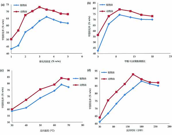 圖3.(a)催化劑量,(b)甲醇與油的摩爾比,(c)反應(yīng)溫度和(d)反應(yīng)時(shí)間對(duì)甲酯產(chǎn)率的影響。