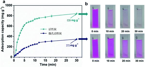 由于縮短吸附時(shí)間對(duì)于經(jīng)濟(jì)有效的工業(yè)操作具有重要意義,我們進(jìn)一步采用超聲輔助策略來加速RhB吸附并縮短制備的活性炭的飽和時(shí)間,這對(duì)制備的活性炭的孔結(jié)構(gòu)幾乎沒有影響。超聲輔助下的吸附時(shí)間固定為30分鐘。圖3a顯示了在30分活性炭和微孔活性炭作為時(shí)間函數(shù)的吸附容量,活性炭從中獲得高達(dá)839 mg/g-1的高RhB吸附容量。在30分鐘內(nèi)(飽和容量的99%),而微孔活性炭可以獲得67%的飽和吸附容量(345 mg/g-1)),進(jìn)一步證明了分級(jí)多孔活性炭相對(duì)于微孔活性炭的吸附動(dòng)力學(xué)優(yōu)勢。圖3b進(jìn)一步說明了這兩種樣品隨時(shí)間的上清液的顏色變化,其生動(dòng)地證明了活性炭相對(duì)于微孔活性炭的高速吸附能力。